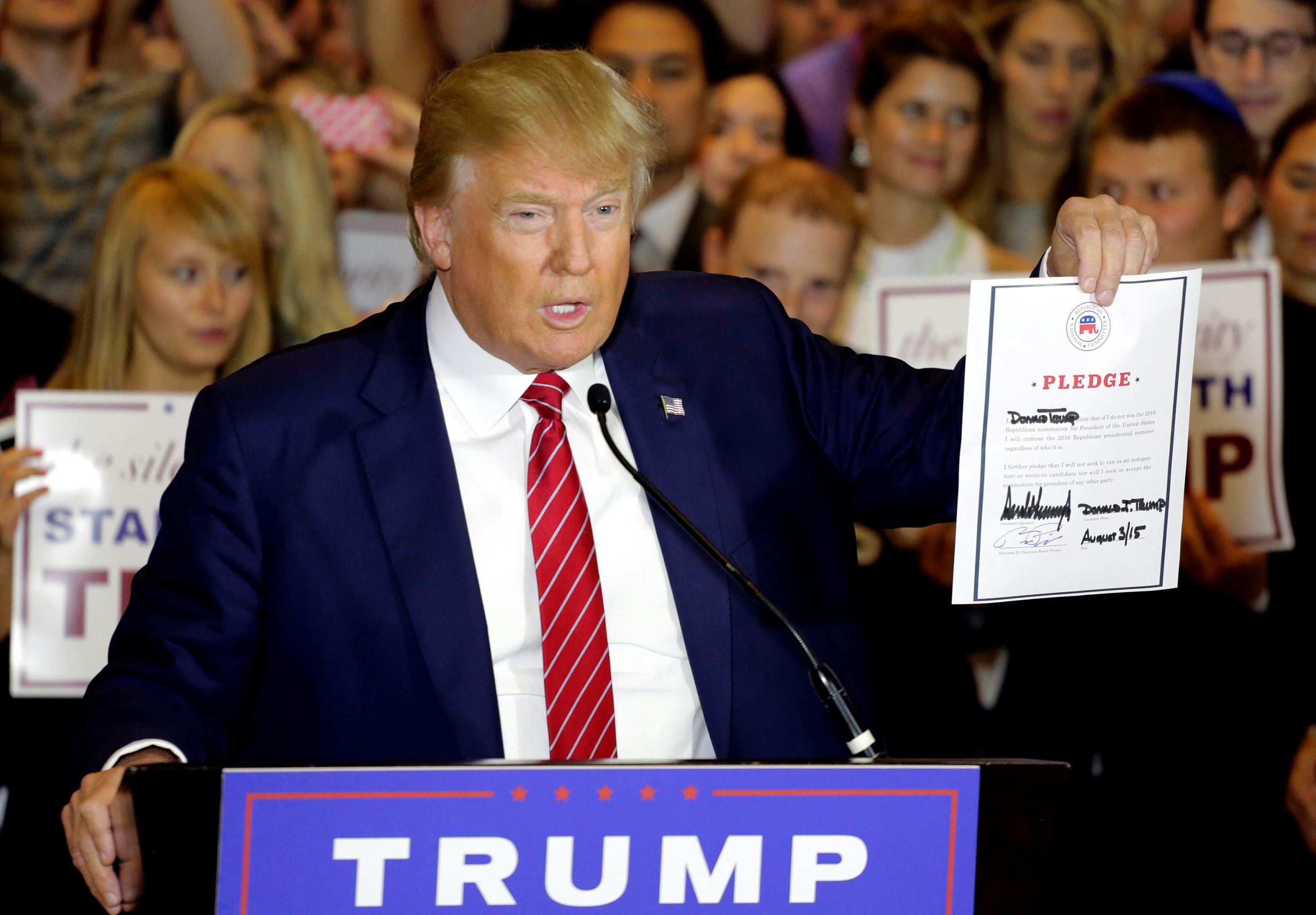 GOP front-runner Donald Trump signed a formal pledge crafted by the Republican National Committee that he will not run for president as an independent if he doesn't win the party's nomination.